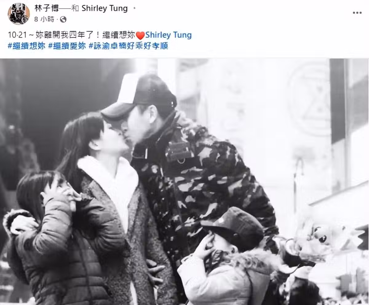 今日是董燕君的逝世4周年,林子博今早發文悼念,他寫道:「10·21~你離開我四年了!繼續想你Shirley Tung」,並帶話題表明「繼續想你、繼續愛你、詠渝卓楠好乖好孝順。」