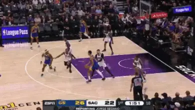 在接球一瞬間,勇士球員散開從而為希爾德創造出和德羅贊一對一的機會。連續三次胯下後一個簡單變向希爾德出手三分。需要說明的是,德羅贊完全沒有失為並且給與了很大的投籃干擾。單就這個回合而言,希爾德還具備一定的三分持球、搶投能力。