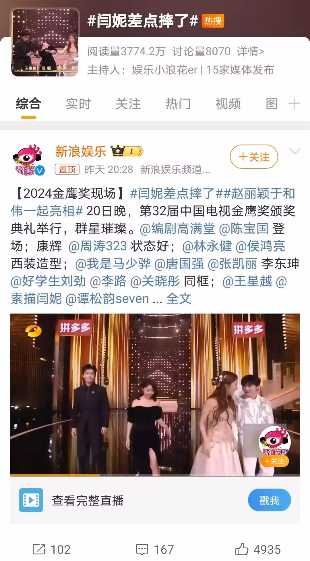 閆妮金鷹節險摔,王星越譚松韻暖心相助,微醺人設引熱議_手機搜狐網