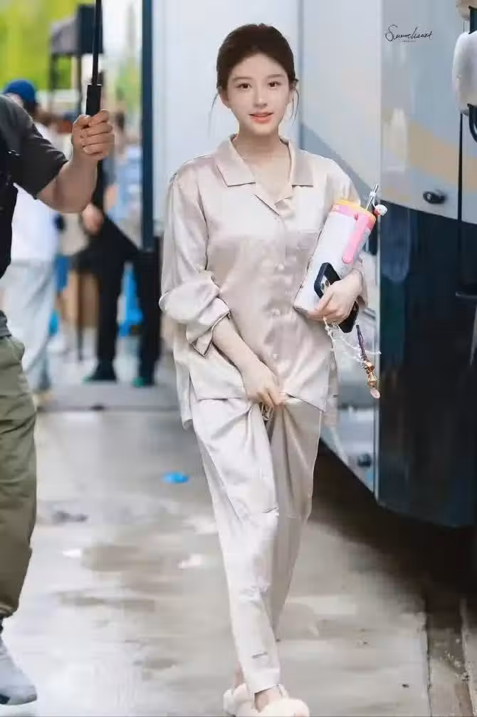 這一套服裝與前幾款相比,更加貼近日常穿搭,尤其適宜初秋時節的氛圍。它選用了絲綢面料,觸感細膩且富有質感,穿上身後帶來的是無與倫比的舒適體驗。絲綢材質輕柔地貼合肌膚,展現出一種高級的親膚感。