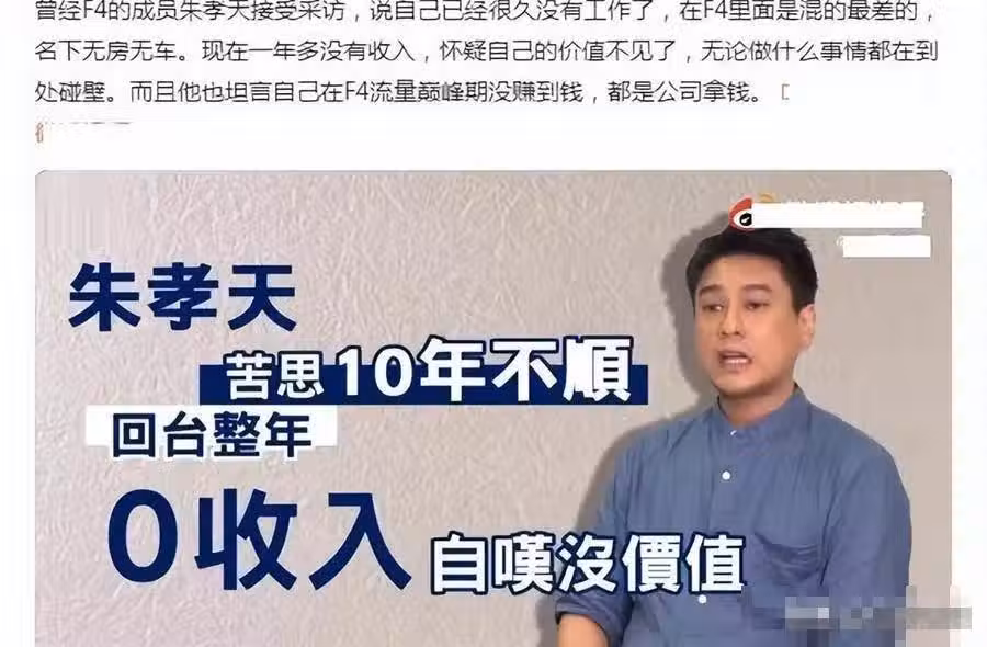 朱孝天真的沒錢嗎?《流星花園》後,他以主角身份參演過多部作品,錢自然是沒少賺,據他所說是給父母、岳母還有妻子買了房。