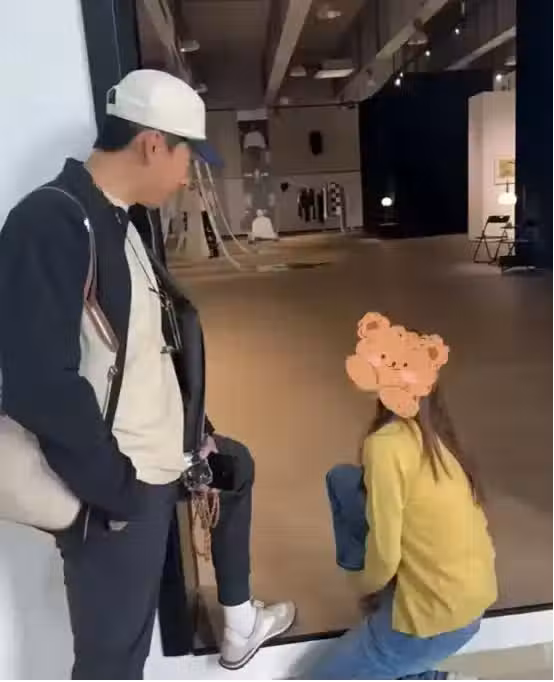 只見施伯雄在上傳的照片中,他正單手插兜,耍酷的將左腳放在台階上,而在他旁邊正蹲著一位身穿黃色外套的女士,她單膝下跪,看樣子應該是在綁鞋帶。