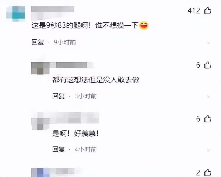 這可是跑出9秒83的腿啊!誰不想摸一把?網友們紛紛調侃。
