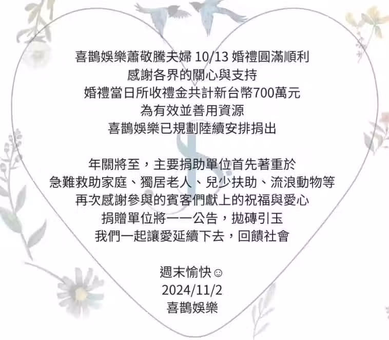 11月2日,蕭敬騰經紀公司宣布,將婚禮收到的700萬台幣的紅包全部捐出,摺合人民幣156萬。這筆錢分別捐給急難救助家庭、獨居老人、兒少扶助、流浪動物等單位,用行動回饋社會,此舉大受好評。