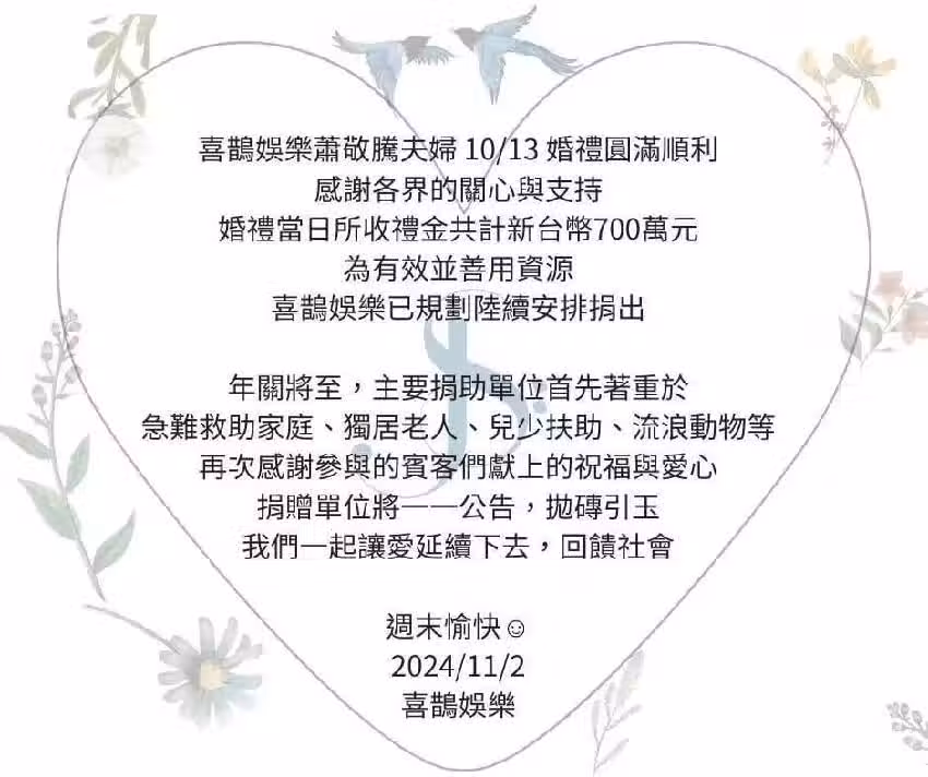 提及年關將至,為有效善用資源,他們公開主要捐助單位,首先著重於急難救助家庭、獨居老人、兒少扶助、流浪動物等,緊接著表示:「捐贈單位將一一公告拋磚引玉,我們一起讓愛延續下去,回饋社會。」夫婦倆再次感謝參與的賓客們獻上的祝福與愛心!