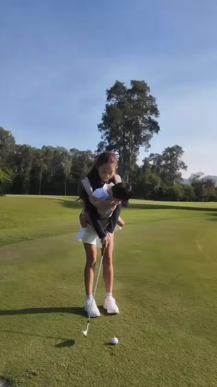 不過在社交平台上載的影片中,見到她打高爾夫球期間,一時將兒子背在胸前,一時又將兒子放到草地上的小椅子,看起來感到危險,稍一不慎兒子就會被高爾夫球砸中,又或被球桿揮中,後果不堪設想。