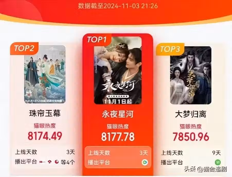 目前熱門的10部影視劇,《永夜星河》第一,《珠簾玉幕》,緊隨其後