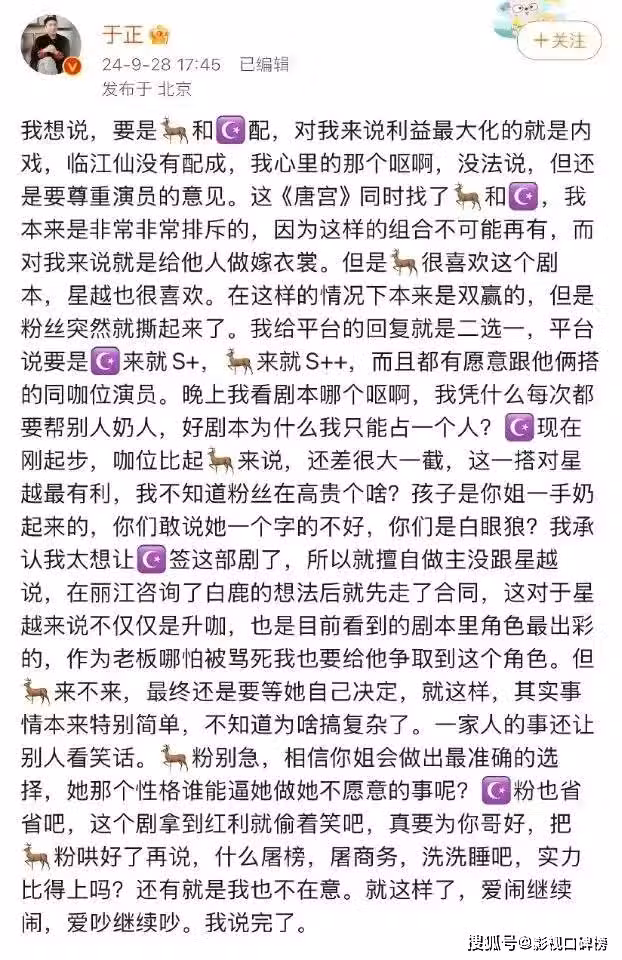 於是,白鹿新劇《唐宮奇案之青霧風鳴》又需要帶新人。作為上升期的流量花,選擇搭檔原本應該是很慎重的事情,然而老闆打算直接採用捆綁營銷的手段讓白鹿和王星越三搭。當初預感到白鹿和王星越將要三搭時,於正就特意在社交平台髮長文解釋「老人帶新人」的公司文化。然後斥責王星越粉絲不懂事,應該給帶他出來的前輩白鹿一些最基本的尊重,要不不就成「中山狼」了。