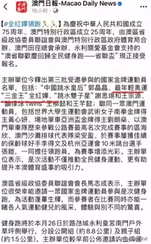 10月24日,澳門迎來了一場別開生面的領跑公益活動,咱們的奧運英雄們——全紅嬋、盛李豪、陳夢、王宗源等紛紛受邀前來,場面那叫一個熱鬧!