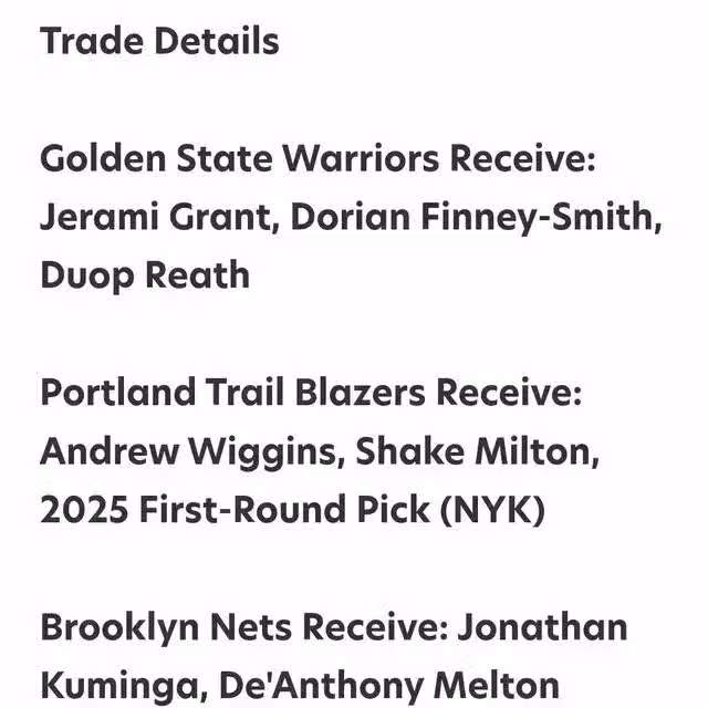 金州勇士隊交易獲得:傑拉米格蘭特,多里安芬尼史密斯,多普里斯