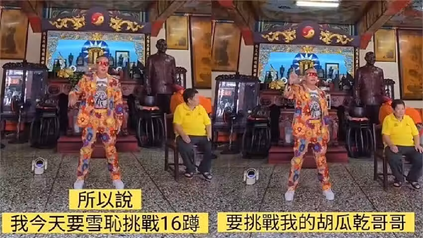 音樂一響,他隨著節奏起舞,到了開始「蹲」的時候,他前面幾蹲幾乎是快到地面才起身,影片後面則可以看到他半蹲就起身,讓不少網友笑說「這一樣在開合跳」,16蹲要直上直下,才算挑戰成功。