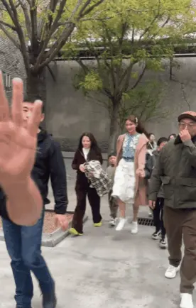 視頻中的林志玲身穿藍色毛衣搭配半身裙,外面套了一件粉色呢子大衣,走起路來一蹦一跳,看著活力四射。