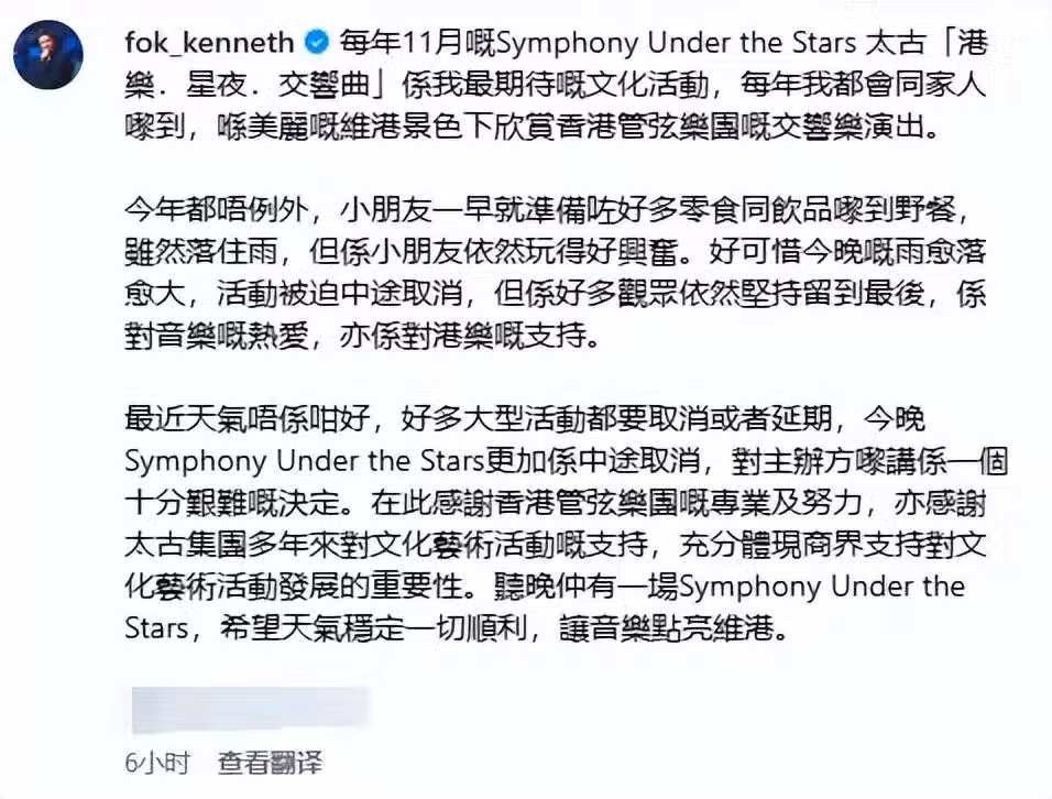 霍啟剛發文透露一家現身維港看演出,小朋友帶了很多零食,雖然下著大雨但他們還是很興奮,可惜雨越下越大,演出被迫取消,但觀眾堅持到最後,是對香港音樂的支持。
