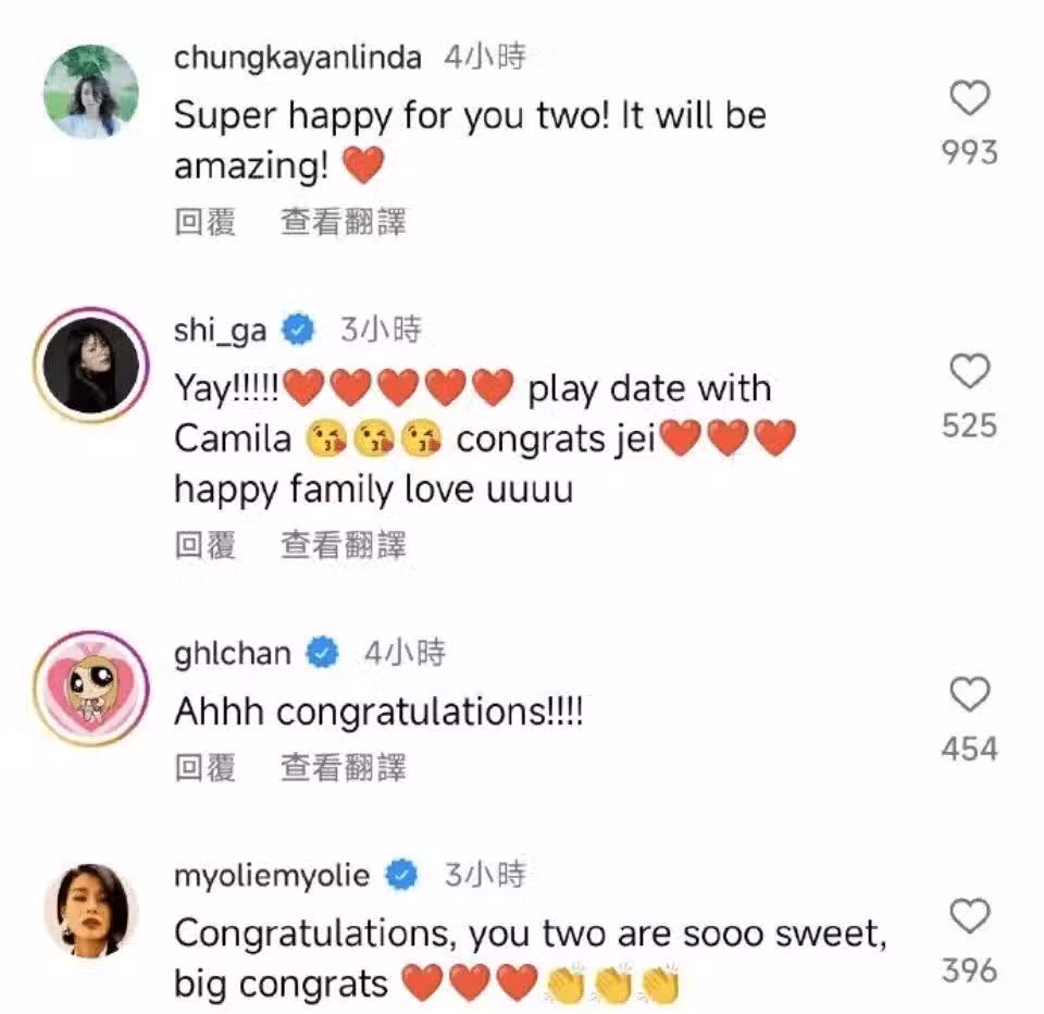 消息傳出後,不少圈中好友都紛紛送上自己的祝福,其中包括連詩雅、楊茜堯、胡杏兒、胡定欣、馬國明夫婦、李施嬅以及鍾嘉欣等人,看得出黃翠如的人緣很好,加上其另一半也是圈中人,自然有很多藝人好友。