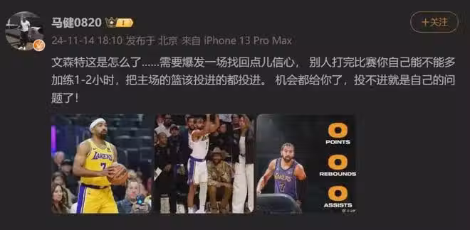 馬健矛頭指向的,是一名湖人球員,但不是八村塁、里夫斯或者克內克特等熱門球員,而是文森特。
