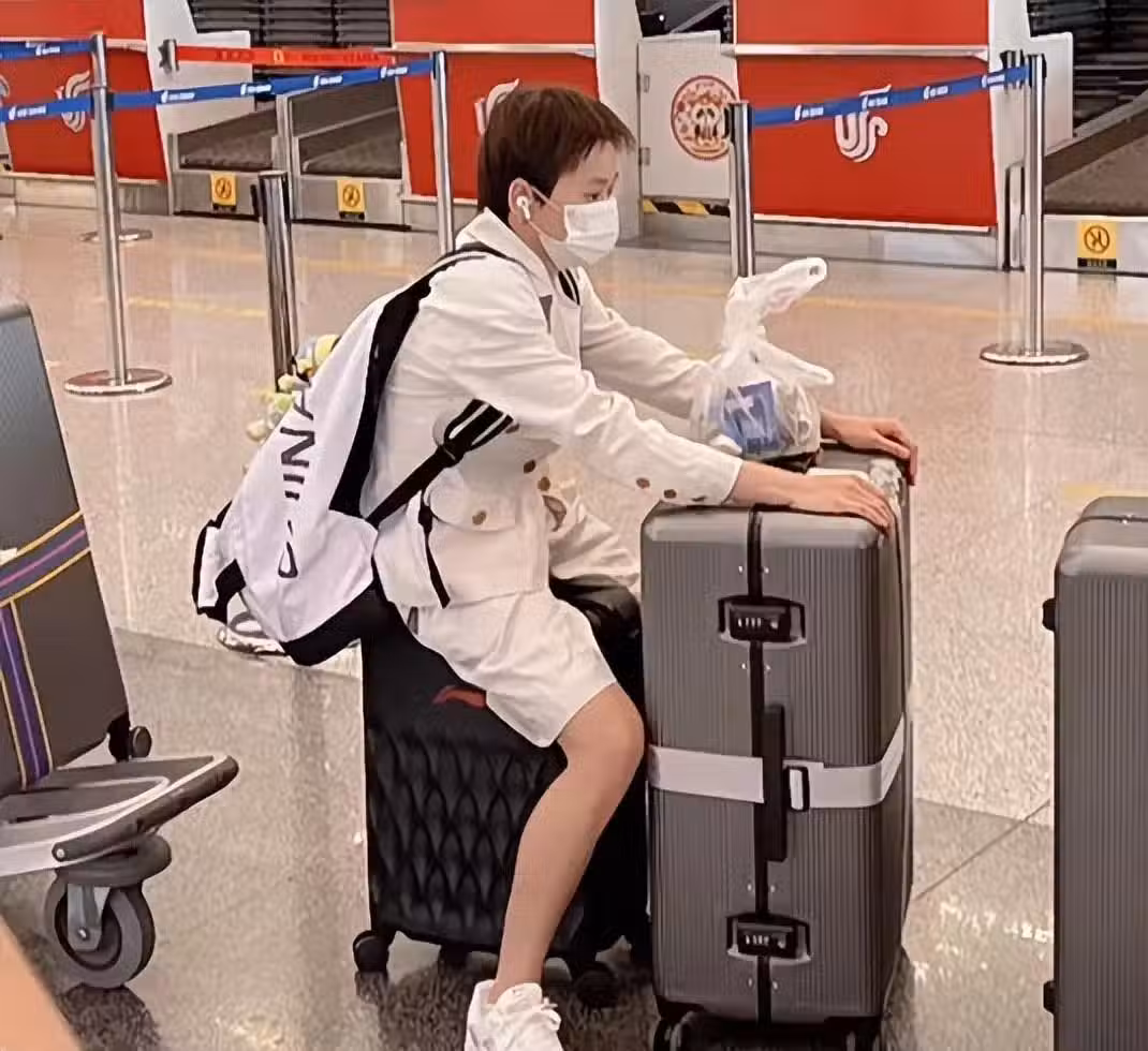 全紅嬋在機場等待的時候,坐在箱子上聽歌。和兩年前相比,全紅嬋長高了一些,但是和張家齊以及陳芋汐相比,個子還是矮一些。