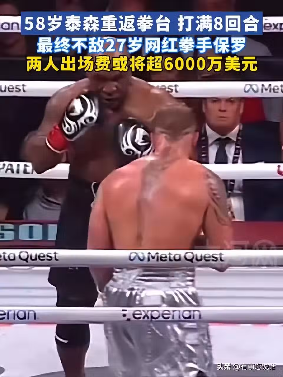 到了第二回合,兩人還是互相試探。泰森被保羅打到一下,不過保羅的組合拳也沒占到更大便宜。隨著回合增加,泰森的體力開始有點跟不上。