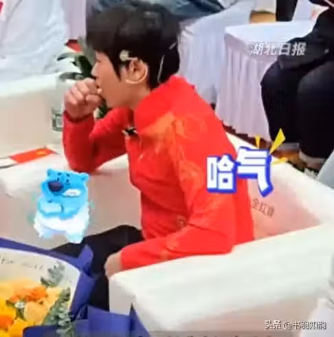 今天下午全紅嬋抵達武漢,參加公益活動。天氣太冷,把坐在台下嬋寶凍的對著手吹哈氣,搓手,把手壓在腿下。後來趕緊拿衣服把腿給蓋上了。看到坐在身旁的李倩也冷,把衣服的袖子分給了李倩。