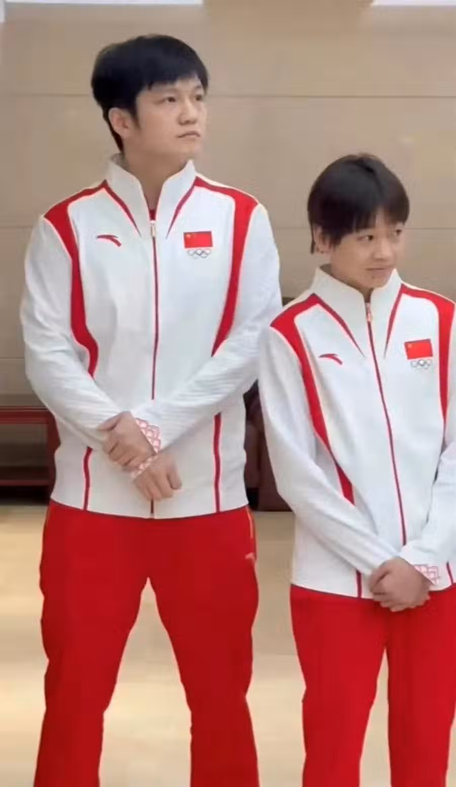 在中國體育代表團出征巴黎奧運會的動員大會上!我們看到樊振東、全紅嬋再度同框。網友調侃:一大隻、一小只在一起非常可愛!只是這次沒有火腿腸,而且嬋寶乖乖的站在那裡,雙手交叉穩重的站在大哥旁邊。網友:嬋寶變成穩重的大人啦!