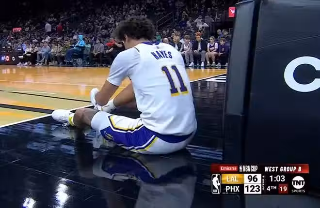 扣個籃把自己扣傷了!湖人神塔最後1分鐘重傷,詹皇氣得眉頭緊鎖