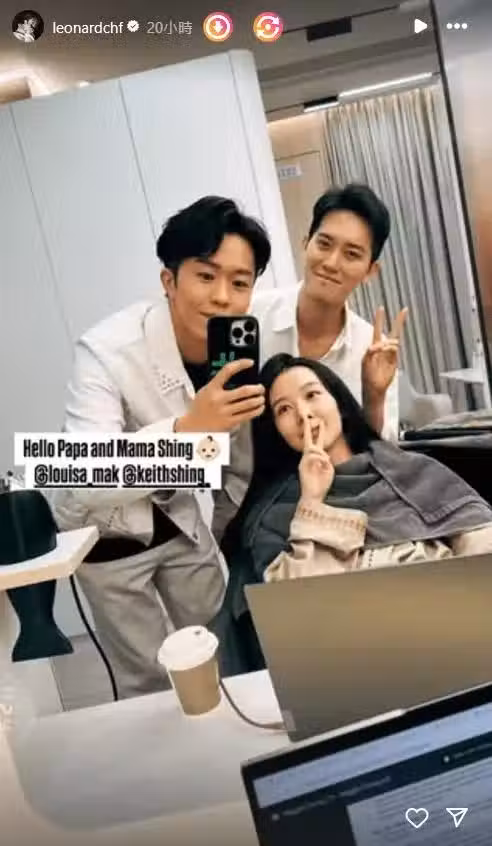 鄭衍峰亦在相片上寫上:「Hello Papa and Mama Shing BB.」而等待老婆剪頭髮的盛勁為,其實頭髮也長得厚厚,他比麥明詩更加需要剪髮。