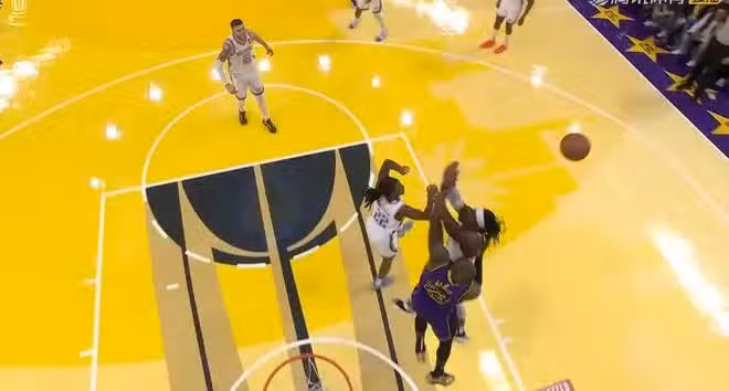 就是當時下半場湖人還落後的時候,詹姆斯在半空當中跳起傳球助攻克內科特投中三分,結果落地時他被多爾特狠狠的撞倒在地上,緩了半天,這個球裁判反而沒吹哨。回過頭來湖人退防的時候只能4個防5個,詹姆斯就一直躺在雷霆半場。