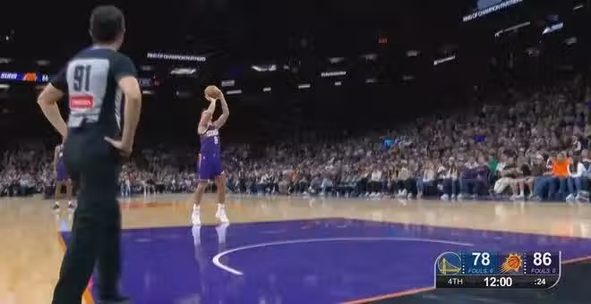 第三節後半段,勇士命中率下降,沒能延續追分。三節打完,勇士78比85落後7分,庫里單節15分!第四節出現時光倒流,裁判發現第三節最後55秒庫明加打手犯規,當時阿倫沒罰球,讓阿倫補罰兩次,太陽又加了2分(78比87)。