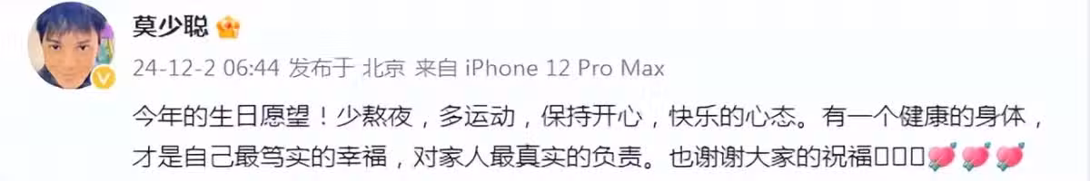 12月2日一早,前邵氏當家小生莫少聰在社交網更新一則動態,附文寫道:「少熬夜、多運動,保持開心、快樂的心態;有一個健康的身體,才是自己最篤實的幸福,對家人最真實的負責,謝謝大家的祝福」,並分享一張8人慶生大合照。