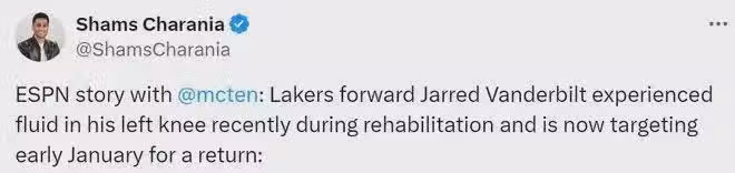 爆料王Shams報道範德比爾特左膝積液,預計明年一月初才能復出。