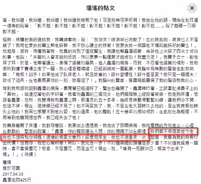 鑫濤、瓊瑤先後過世 平鑫濤2019年5月在家人陪伴下安詳離世,享壽91歲。 瓊瑤把後事處理完後,發了一篇長文悼念亡夫併流淚道:「永別了!我愛!」當時,有網友希望他們來生還能在一起;沒想到瓊瑤回應:「不要!我不要有來生,如果有來生,也不希望跟他再相遇!你太年輕,還不懂這種感覺。 」至於是否因為太痛? 瓊瑤則回:「美好的時光,往往匆匆而去!痛苦的時光,總是度日如年!」5年過去,瓊瑤上月底連發兩篇「憶亡夫」,今被發現失去生命跡象,令人不勝唏噓。
