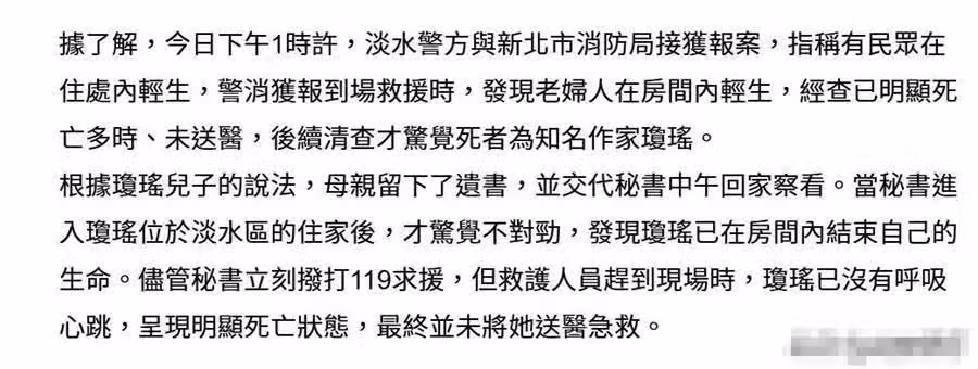 瓊瑤的63歲兒子表示,母親留有遺書,交代秘書中午回家看看,沒想到進房間發現已經無力回天。