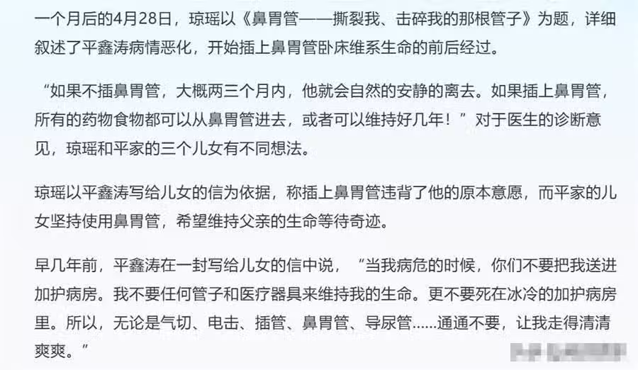 丈夫的子女違背他的意願給他插上了鼻胃管,平鑫濤與前妻生的兒子平雲和瓊瑤意見不同,更發文反駁瓊瑤,順帶重提瓊瑤插足父親婚姻,傷害其母親的舊事。