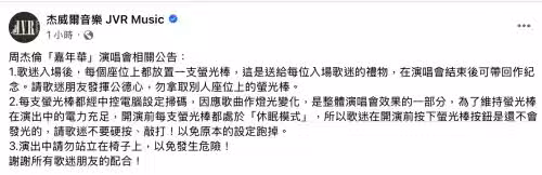 ▲傑威爾在社群平台貼出3點公告,強調「演出中請勿站立在椅子上,以免發生危險!」盼歌迷朋友全力配合。(圖/翻攝自傑威爾臉書)