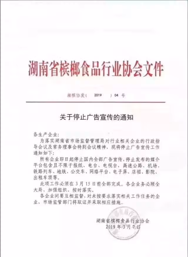 2019年3月,大概是迫於輿論壓力,湖南省檳榔食品行業協會發布了「關於停止廣告宣傳的通知」。