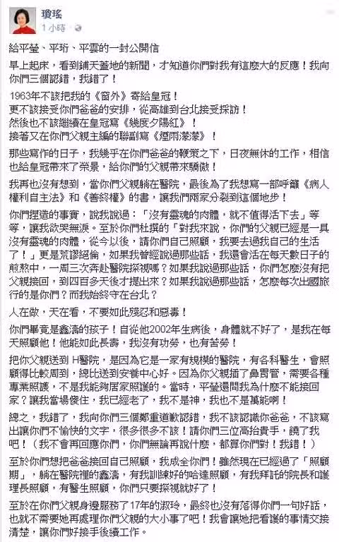 另外在皇冠集團這邊,平鑫濤3個子女在父親重病失智的時候公開寫信手撕瓊瑤,這也讓瓊瑤在晚年十分的心痛。