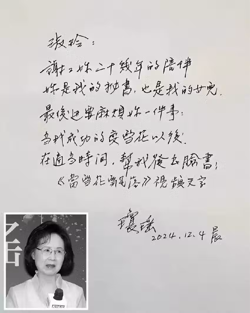 然而,在遺書的最後一行,瓊瑤補充道:「《當雪花飄落》的視訊文字。