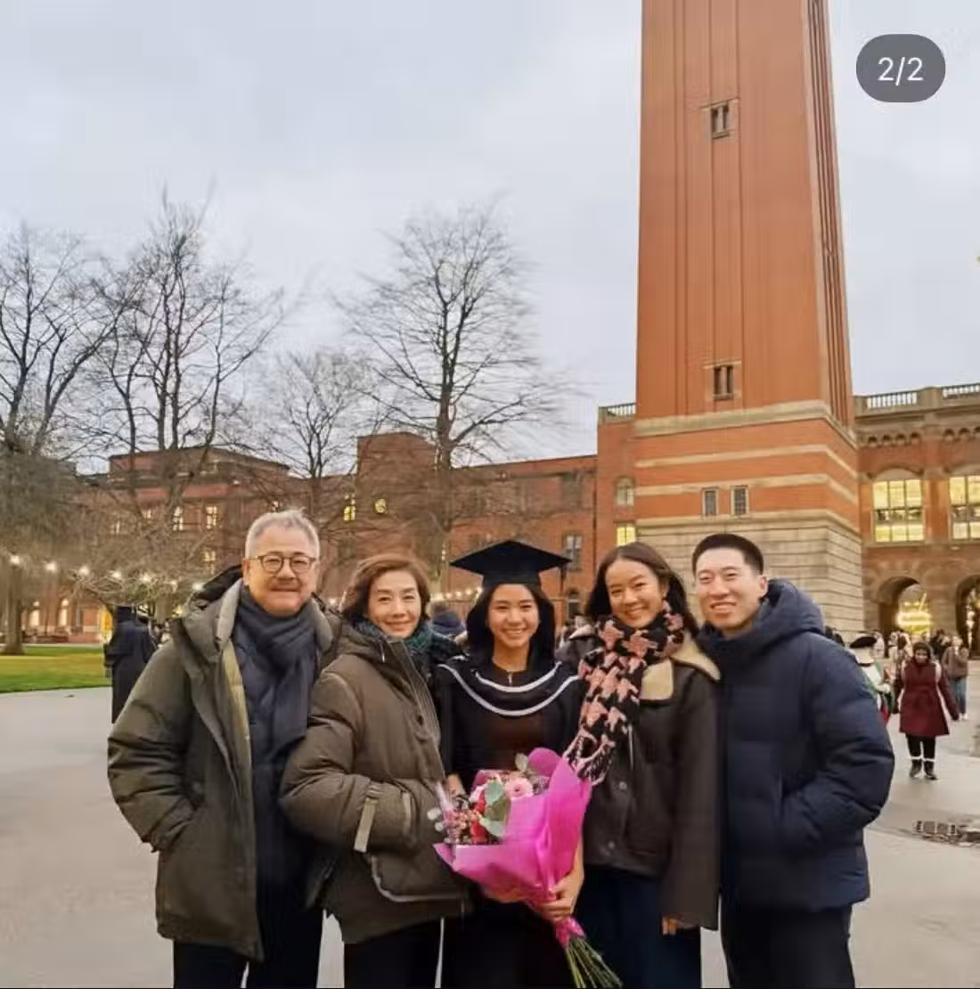 毛舜筠次女碩士畢業,全家齊聚英國慶祝,79歲丈夫滿頭白髮好慈祥