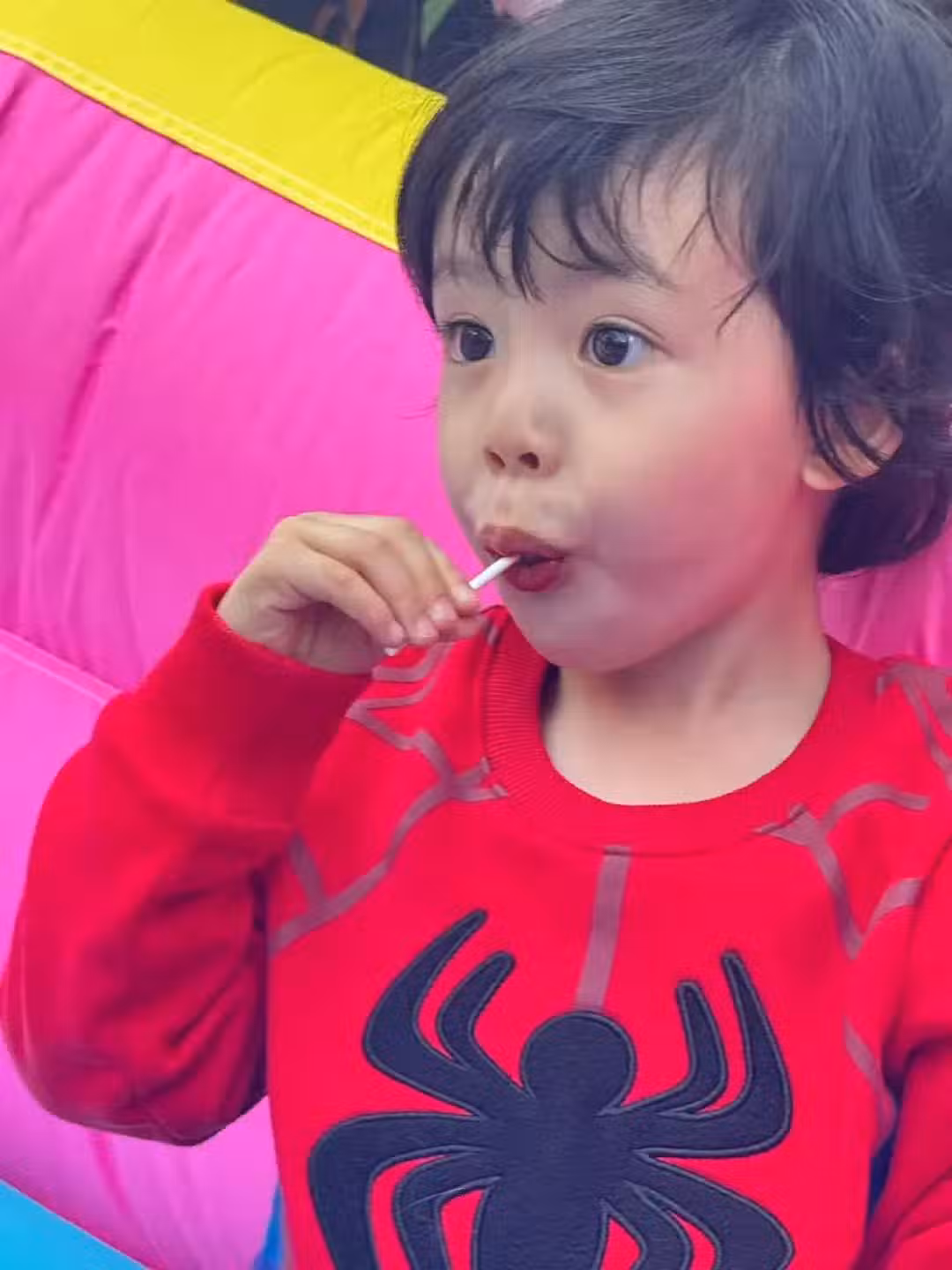 小壽星Eden留著一頭微卷髮,身穿紅色蜘蛛俠衣服,看起來十分軟萌可愛,一雙大眼睛尤為搶鏡,完美繼承父母優越基因,小正太模樣真的好帥,估計長大比爸爸還帥哦。