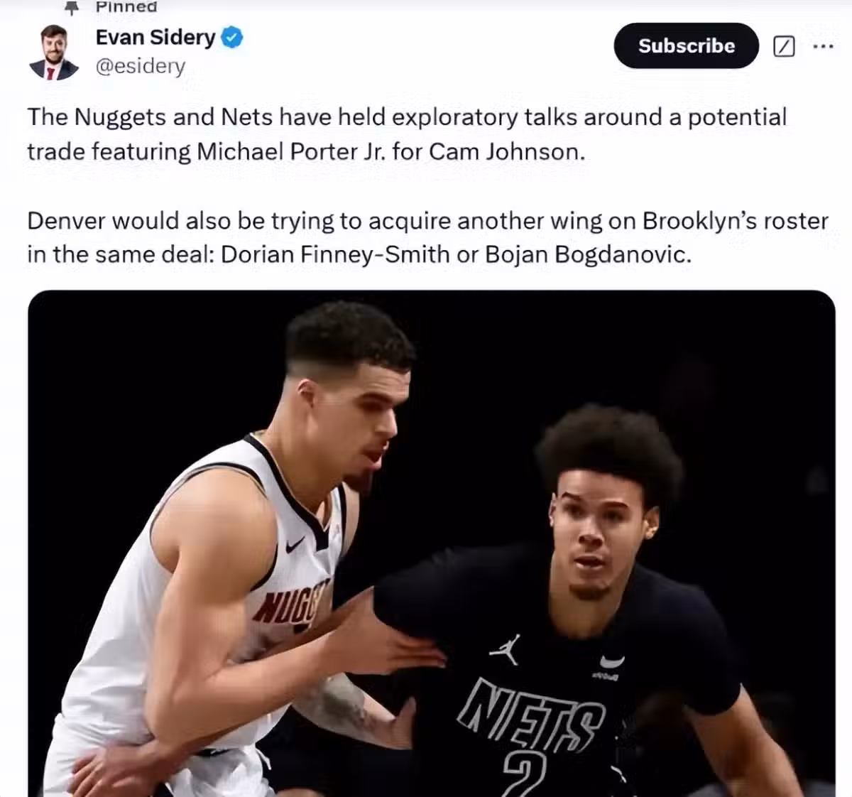 就薪金來看,小波特年薪3,500萬美元,卡梅隆-詹森和芬尼-史密斯的年薪加起來也是3,500萬美元,可以配平。2021年,掘金隊和小波特簽下了5年2.07億美元的頂薪合同;2023年,籃網隊4年1.08億美元和卡梅隆-詹森完成續約;2022年,獨行俠和芬尼史密斯簽下的合同是4年5,500萬美元。這三名球員的總合同金額加起來,達到了3.5億美元。