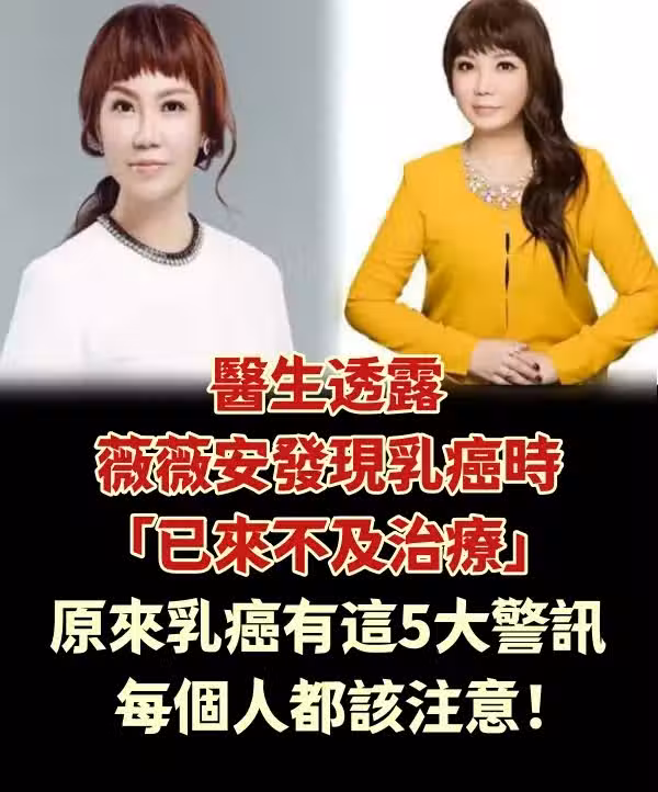 醫生透露薇薇安發現乳癌時「已來不及治療」! 原來乳癌有這「5大警訊」,每個人都該注意。