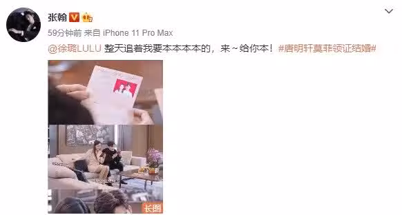 111月8日,張翰曬出「結婚照」點名徐璐,寫道:「整天追著我要本本本本的,來給你本!」