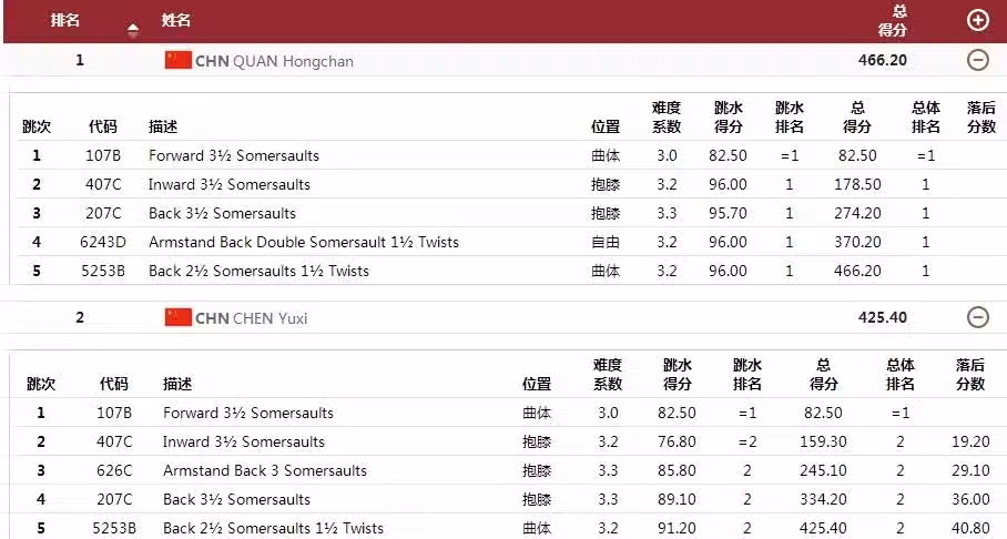 東京奧運會十米台上,陳芋汐與全紅嬋第一跳107B動作都是82.5分兩人並列第一,但從第二個動作開始全紅嬋全部都是第一,陳芋汐都是第二,最難的207C動作全紅嬋都超過了陳芋汐,其實在半決賽與預賽207C動作都是陳芋汐領先全紅嬋。