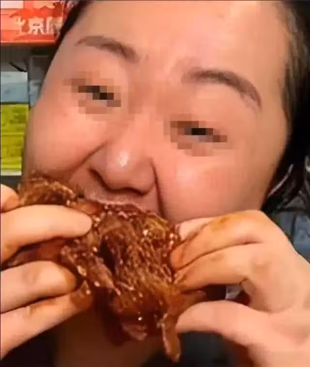 只見,她抱起比頭還大的羊尾油,張嘴就是一大口,滿滿的油脂充斥著她的口腔。