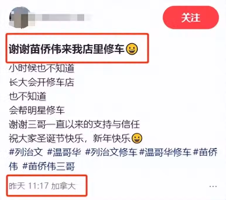 博主是位修車店老闆,昨天苗僑偉去他店裡修車,讓博主激動地發文感慨,說根本想不到自己有一天會幫明星修車,而且還是三哥苗僑偉。