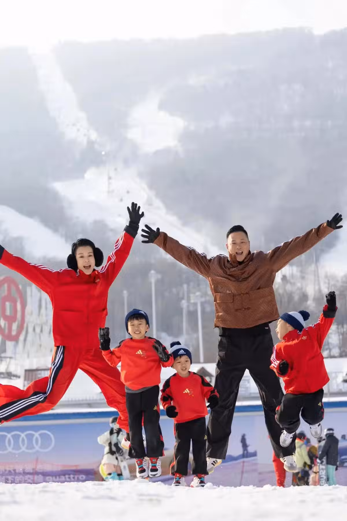 胡杏兒和老公帶三個兒子去吉林滑雪,一家五口在雪地玩耍,好歡樂