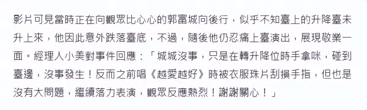 經紀人小美第一時間受訪回應,表示郭富城並無大礙,是在升降機拿麥克風碰到台邊,沒事發生,反而是在唱《越愛越好》時被衣服的珠片刮傷手指,但也沒大問題。