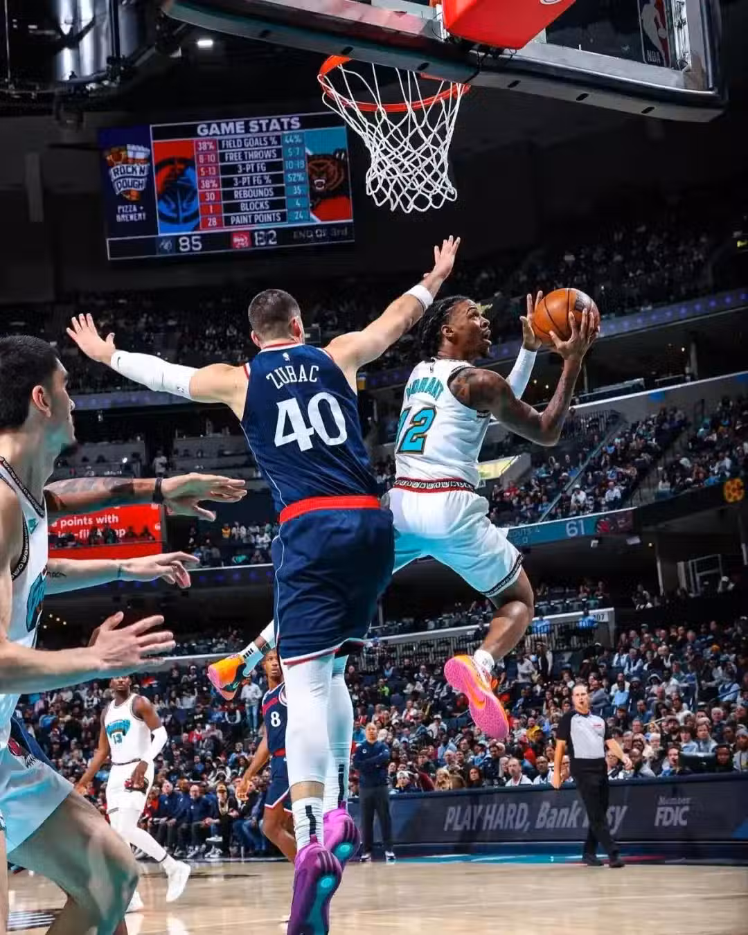 無論上籃還是扣籃,莫蘭特都需要衝擊籃筐。一個重要原因,是他的三分球一直沒開發出來。莫蘭特連續三個賽季,三分命中率不足33%。生涯6個賽季,莫蘭特三分命中率只有31.3%。跟莫蘭特同屆的加蘭,生涯三分命中率38.9%。