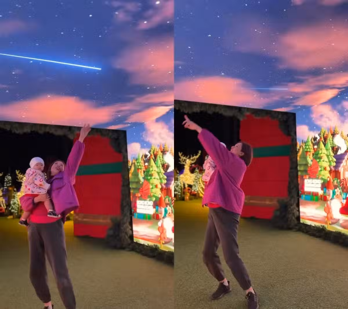 朱慧敏的巨肚向橫發展,又圓又大,但無阻她親自帶女兒,她抱著Shera來到光影隧道時,頭頂一粒流星飛過,舉起左手指著流星大叫,比Shera還要興奮,不停:嘩、Wo、呀...