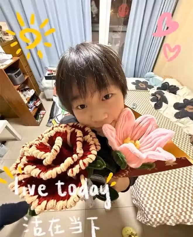 另外一張照片,當然是全紅嬋自己很萌很可愛的照片。她的頭髮又長了不少,劉海能遮到眼睛了。現在全紅嬋不再剪板寸髮型,經常是陳若琳教練為她設計髮型。全紅嬋的這張照片上還寫著:「活在當下。」