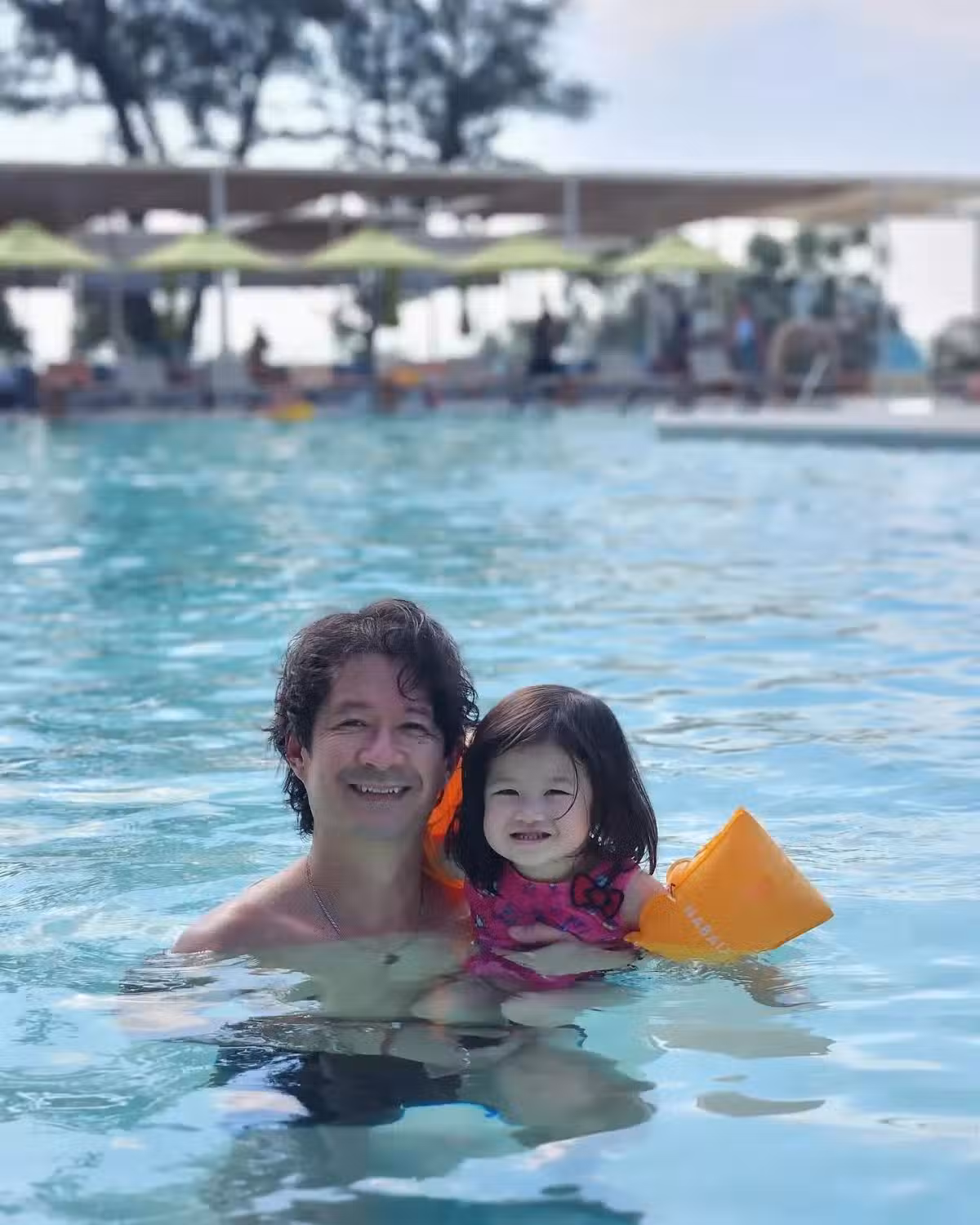 鍾嘉欣還曬出老公帶著小女兒在水裡玩的照片,父女倆都笑得超開心。2歲的小女兒紫琳現在跟爸爸還是很像的,不知道以後會不會也像姐姐和哥哥一樣逆襲變成像媽媽呢。